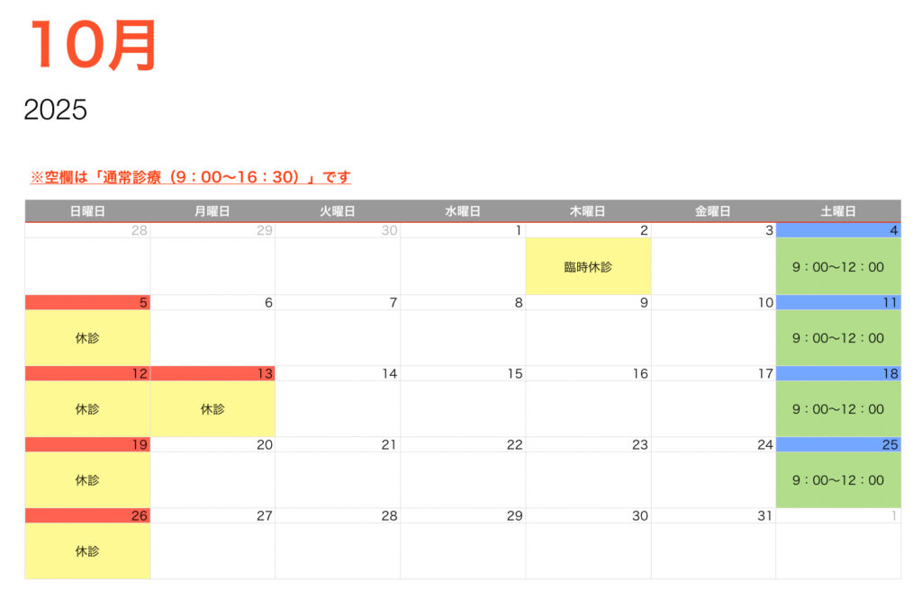 10月の診療日 投稿公開日:2025年9月27日 投稿カテゴリー:Uncategorized 10月の診療日のお知らせです。 おすすめ 年末年始の診療について 2024年12月18日 11月の診療日 2024年10月28日 2月の診療日 2025年1月26日