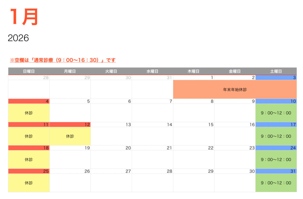 1月の診療日 投稿公開日:2026年1月8日 投稿カテゴリー:Uncategorized 明けましておめでとうございます。 本年もどうぞよろしくお願い申し上げます。 1月の診療日のご案内です(掲載が遅くなり申し訳ありません) よろしくお願いいたします。 おすすめ 11月の診療日 2023年10月27日 3月の診療日 2024年2月22日 9月の診療日 2024年8月24日